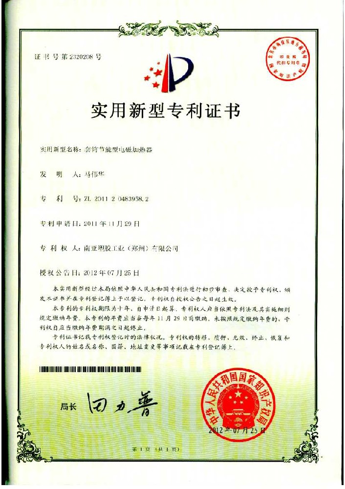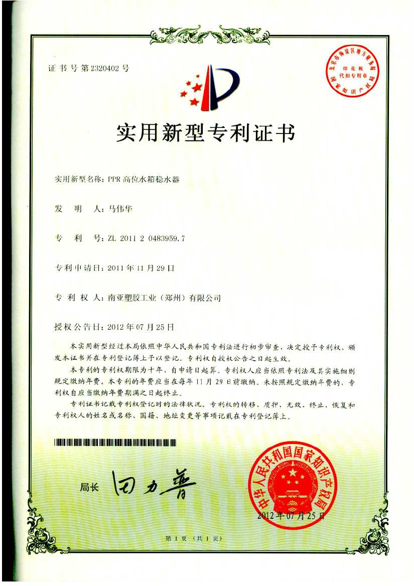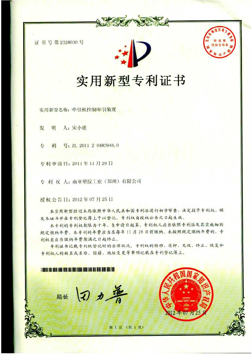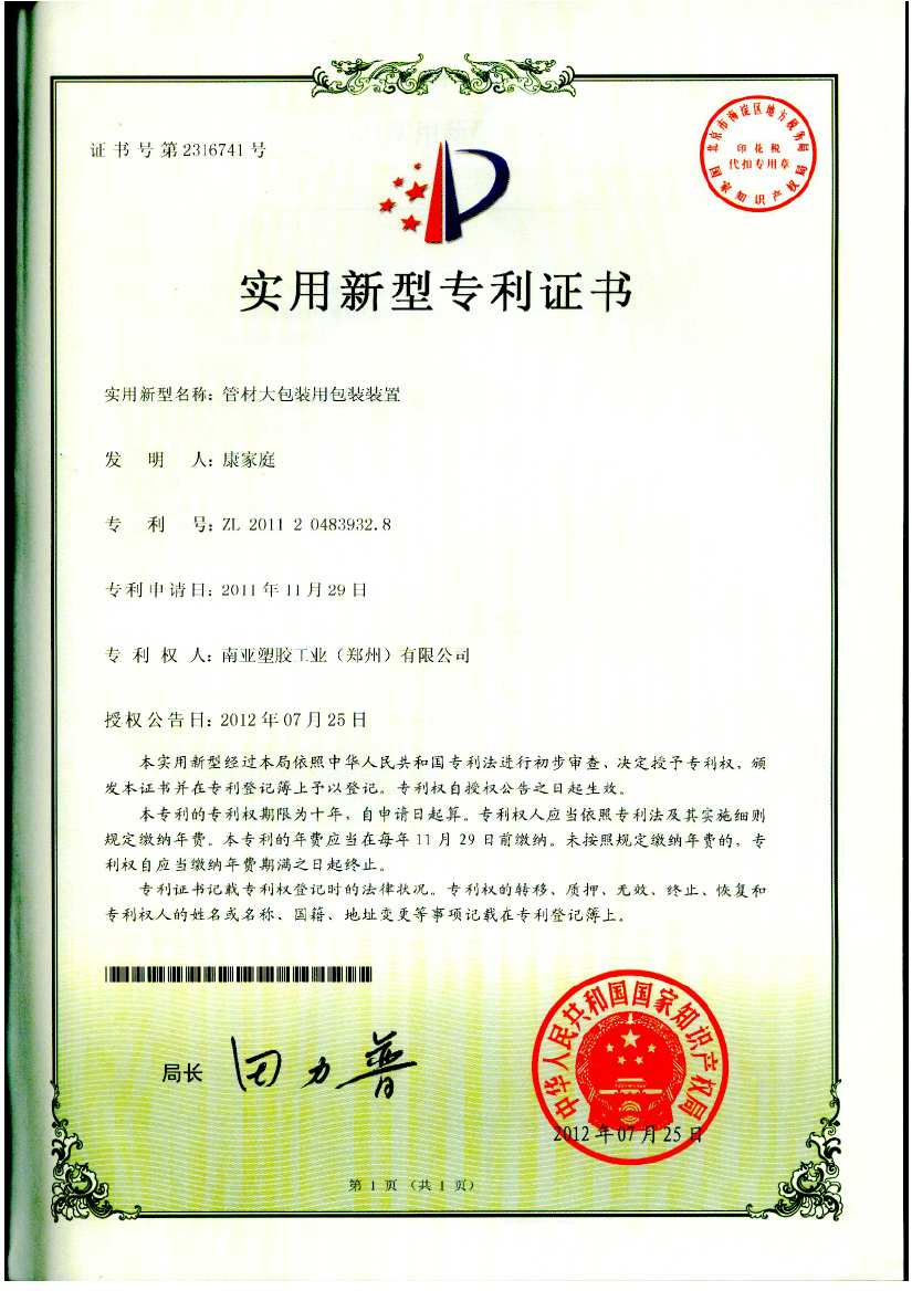 南亚塑胶郑州公司在生产及成品包装方面进行不断创新改进,对于公司创新项目进行了专利申请,经过国家知识产权局审核,符合专利法等政策法规,于2012年7月25日被授权5项实用新型专利。
